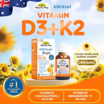Nature’s Way Kids Smart Drops Vitamin D3K2 Organic là giải pháp tối ưu giúp bé hấp thu canxi tốt hơn, phát triển chiều cao, răng chắc khỏe và tăng sức đề kháng tự nhiên.